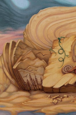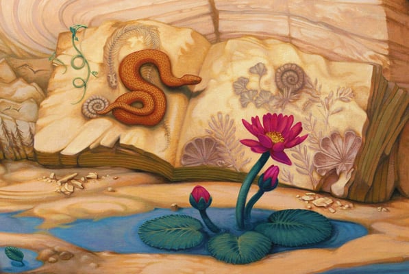 In that painting called "A Geological Novel", the artist imagine those layers as book pages onto which every events and memories of evolution are inscribed, and wait to be understood. In the book one can find meaningfull symbols. For example, the Nymphea or Lotus plant is a strong symbol of a three stepped evolution, and frequently likened to the evolution of human beings. It first sprouts from the mud at the bottom of a dark pond, then the stem has to grow through the water struggling toward light, to finally emerge and bloom in the sun rays."