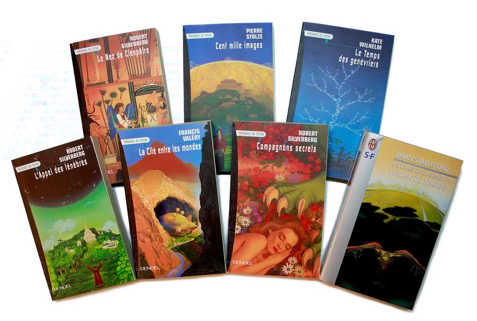 Below: the first image illustrates "La cité entre les mondes" by Francis Valéry, a steampunk uchronic novel which takes place in tropical Africa. The author was granted the Julia Verlanger award for it. The second one is the cover for "Cent mille images" by Pierre Stolze, he was granted the Rosny Ainé award for this book. It tales a Gods and Godesses mythological story of our future, in the regions of Tibet. The last one, "L'appel des ténèbres" is a compilation of three superb short stories written by Robert Silverberg.